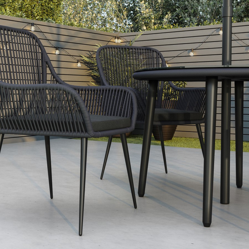 Transform your garden, patio, or balcony into a stylish outdoor space with this beautifully designed 4-seater dining set. It features a contemporary round tempered glass-topped table and four comfortable rope-weave chairs with plush seat cushions. In addition, the included parasol with crank handle offers shade on sunny days and protection from a light shower and slots easily into the parasol hole in the centre of the table. This set is perfect for al fresco dining, morning coffees, or evening drinks with family and friends and even includes a waterproof cover to protect your furniture all year round.
