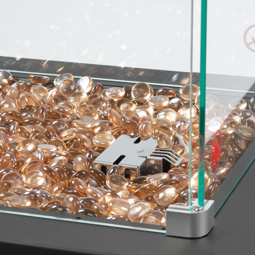 The addition of glass stones within the heater creates a unique flame effect, enhancing the ambiance of your outdoor setting. An aluminium coating and a substantial 45kg weight anchor the heater securely, although this unit will require fixing in position during high winds for added safety and stability.